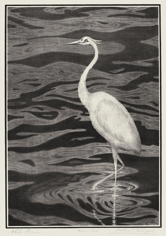 Alfrfed Rudolph arrived later than most to the art world. Having started as an engineer, eventually becoming vice-president of the American Ball Bearing Company and a consultant to the War Department during World War I, it wasn’t until ailing health forced him to retire to Nevada that he discovered printmaking. It then became the main focus of his life until he died in 1942. Perhaps due to his background in mechanical drafting, Rudolph’s images are careful, precise, and highly detailed. However, there is no lack of expression or beauty in his work, and his instinctual sense of composition is evident in the stunning “White Heron,” contrasting the bright, still, elongated form of the marsh bird against the elegant ebb and flow of the water surrounding him. Most herons are bluish in color unless they are juvenile herons that are mostly white with some darker wing feathers, which indicate their transition. There is white morph adult of the Great Blue Heron which is found in south Florida. The bird is larger than the Great Egret with a heavier bill and paler, yellow-gray legs.