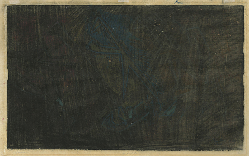 This remarkable woodcut by Louis Schanker is titled "Indian Dance" in the Brooklyn Museum catalogue of his prints, but this impression is simply titled "Dance." Schanker was known for his unorthodox and creative approach to the color woodcut. Printing with oil-based inks he would often print a second, third or fourth color before the previous ones had dried, creating a merging of the color on the paper and making each impression unique, a monoprint. This impression has rich color, printed on a thin wove paper, which has become acidic but the oil base image remains unaffected by what is happening in the margins.