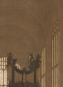 The King's College Chapel is among the most famous structures in Cambridge, UK. Built five years after the school's founding by King Henry VI, it took five monarchs between 1446 and 1547 to complete and is the oldest surviving building on the campus. Its most celebrated feature may be its extraordinarily delicate "fan" vaulting of the Nave, the largest of its kind in the world, shown here in the upper two thirds of Verpilleux's color woodcut.