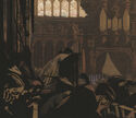 Also depicted is the "rood screen," an intricately carved wooden structure that supports the organ, shown at the center of the composition. Built beginning in 1532 to celebrate the marriage of King Henry VIII and Anne Bolyn, their intertwined first initals H and A are carved throughout. Interestingly, after he had his wife executed in 1536, Henry attempted to have all traces of her erased from his properties; this appears to be one of the few monuments that was left untouched.