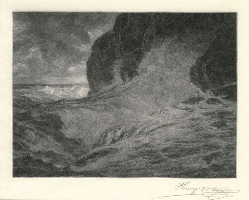 In “Resounding Sea,” executed late in Henry Wolf’s career, master meets master at each artist’s peak. Walf captures the complexity of Dougherty’s composition in the dramatic waves and looming cliffsides with equal expertise, managing to extoll the beauty and force of the scene on a much smaller scale, and in monochrome. This was likely engraved between 1904 and 1914.