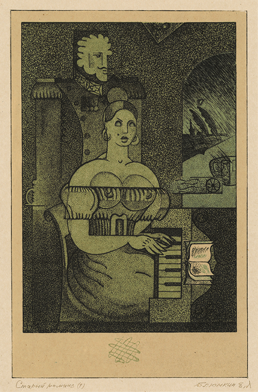 Eugene Blumkin (Evgeny Blyumkin) is a Russian printmaker, best known for his mezzotints but who also works in etching, engraving, lithography,and woodcuts. Married to artist Margarita Lobanov, they live in St. Petersburg, Russia. This image is from a series of prints titled 'Old Romance', published in 1992. Learn more about his life and education in our biography in link above.