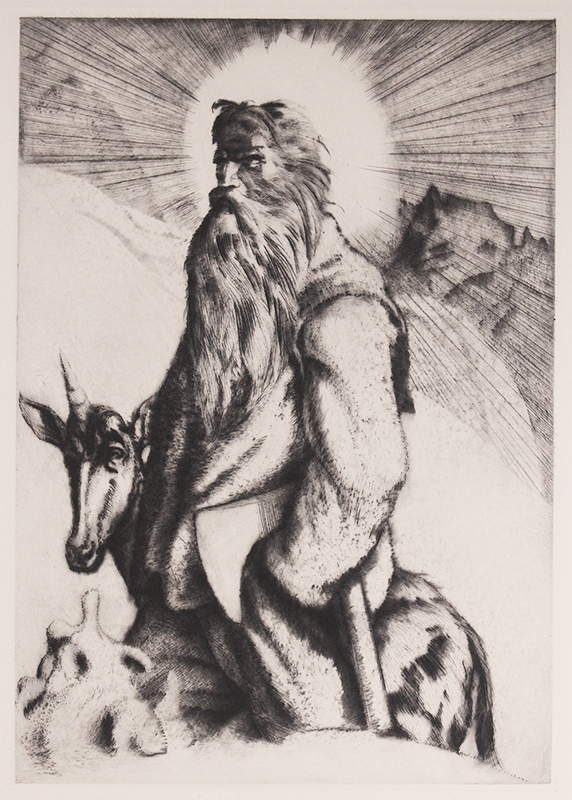 Some sources list the title of this 1920 intaglio as “Heiliger Matthias,” or Saint Matthias, who is mentioned in the Book of Acts as the apostles’ chosen replacement for Judas Iscariot. Saint Matthias bore an axe and his feast day, prior to 1968, was February 24. Erich Erler’s image, however, appears to have a more mythological than religious representation, with the inclusion of a mystical unicorn and the Saint’s resemblance to bearded Norse gods of the coldest season.