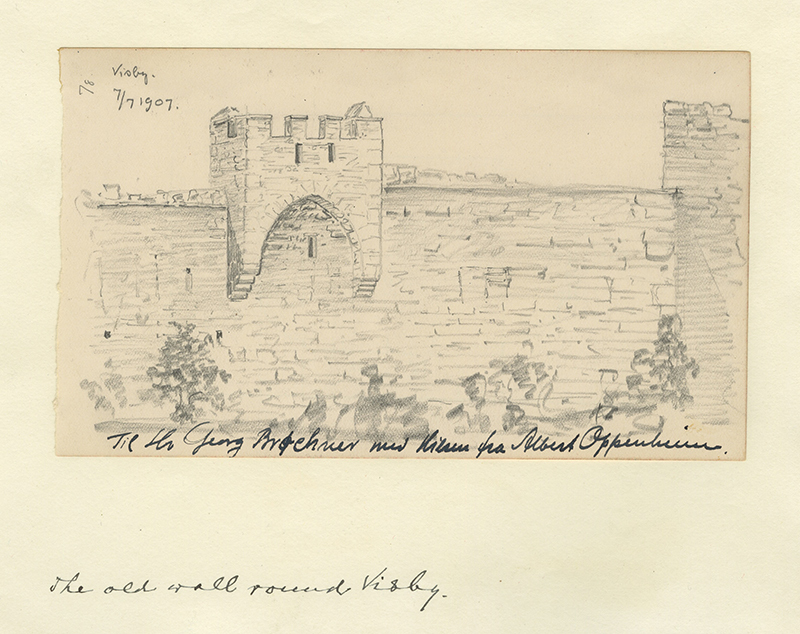 date ul; title ll on backing sheet, dedication lc in image; drawing w/measurements on verso; "in fra Visby" verso