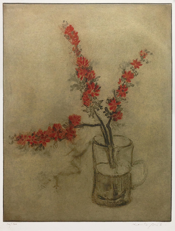 He was especially drawn to the tonality and atmospheric nature of landscapes, and how the mood changed with the light. This image of three branches of red flowers in a glass stein stand out within the modulated background.