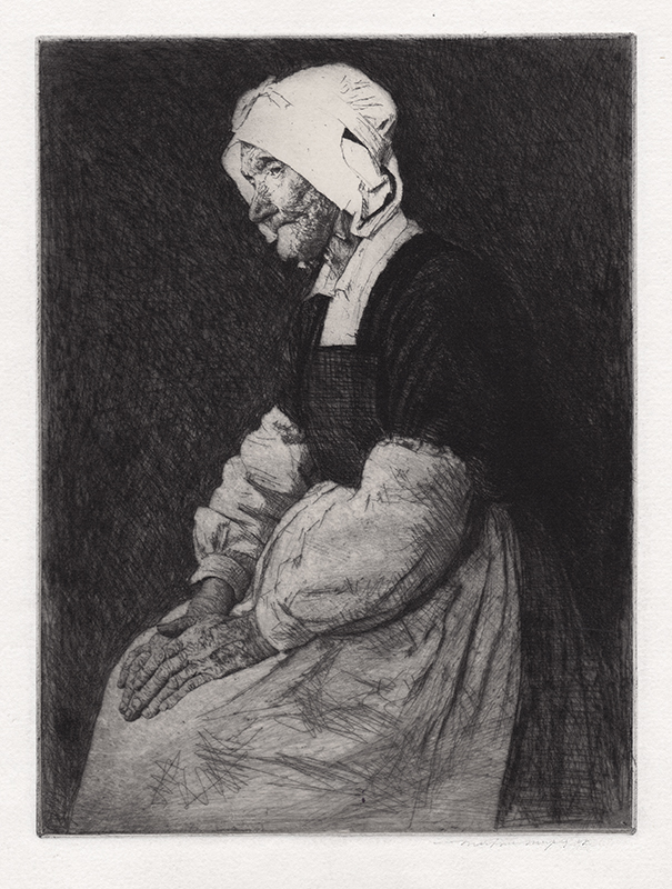 This etching is a portrait done by Menpes after a painting titled "Marie Jeanne" illustrated in Mortimer and Dorothy Menpes' book "Brittany", published by Adam & Charles Black in 1905. Michael L. Gaffer in the Atlas Galleries' catalog on Menpes' prints comments: "Edition sizes are seldom recorded and vary with subject and technique...some of his earlier drypoint portraits are numbered from editions of 25, and the later Venetian views are from editions of 70. It is also thought that many of his prints were not printed to a compete edition, the number of impressions pulled being determined by the wear of the plate and the demand for the works."