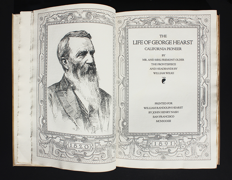 Written by journalist and editor Fremont Older and his wife, historian and writer Cora Baggerly Older, this vellum-bound tome is one of two volumes published by William Randolph Hearst to commemorate each of his parents, George and Phoebe Hearst. The book was printed and bound by John Henry Nash in San Francisco, and the engravings, which include the titlepage and chapter headings, were executed by artist William Hancock Wilke. In 238 pages the authors discuss the history of the Hearst family in general and the life of George Hearst in detail, beginning with his childhood in Missouri.