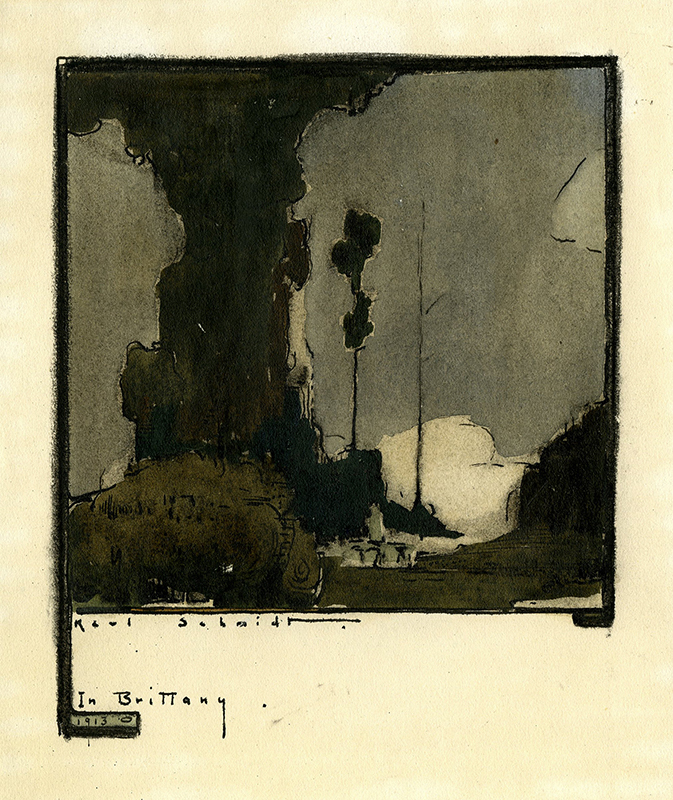 American artist Karl Schmidt (1890-1962) was 23 years old and studying art in England and France when he did this dramatic drawing of the landscape in Brittany. The style, a nod to British artist Frank Branqwyn, is a precursor to his later California landscapes with tall Eucalypti.