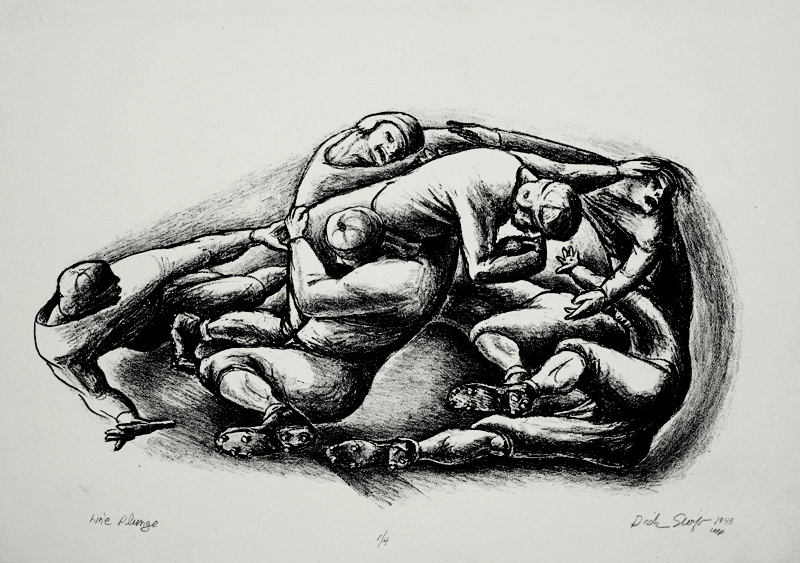 Done over 70 years ago this lithograph of a goal-line plunge illustrates to some degree, how much football has changed during that time, and also how little has changed during the same time.