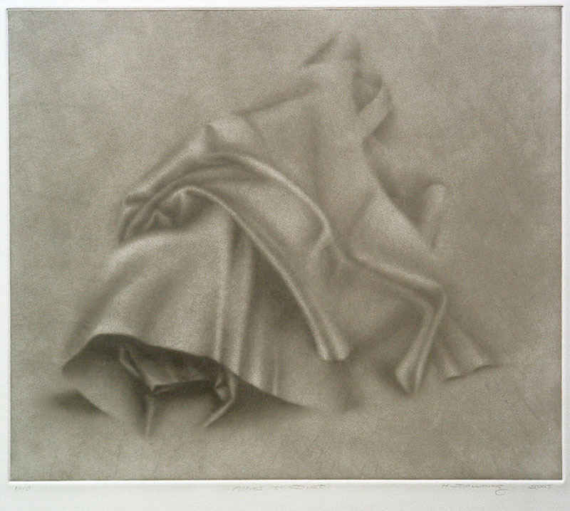 Mezzotint is a form of engraving, whose subtle qualities are achieved with tone rather than line. The artist spends many hours “rocking” a copper plate until the plate has thousands of tiny holes, each with a bit of raised burr that hold a tremendous amount of ink. A fully rocked plate prints a lush, velvety black, unparalleled in any other medium. To obtain an image, the artist scrapes the surface of the plate, variously lowering the levels of the burrs so they will hold less ink and thereby yield gradations of dark and light. Gradually an image emerges out of the darkness. The plate is inked by hand and printed on an etching press. http://www.hollydowning.com/