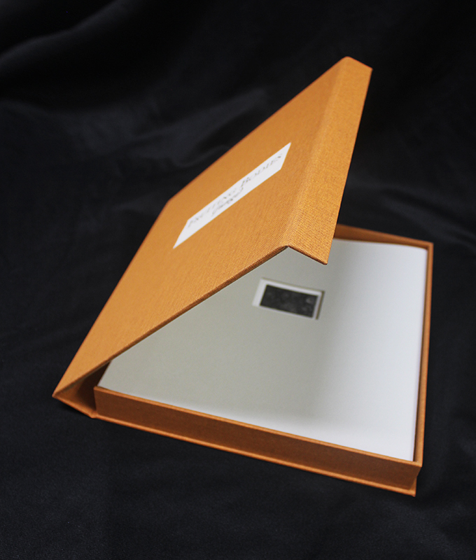 An accordion-style livre d'artiste by Holly Downing in collaboration with Melissa Wagner-Lawler and poets Forrest Gander, Jane Hirshfield, Anna Journey, Christine Boyka Kluge, Ted Kooser, W. S. Merwin, Gary Snyder, Joseph Stroud, and Gary Young. A collection of images and poems that celebrate the magical life & death idiocrasy of fungi. The mezzotints were printed on Downing’s Rochat etching press on Rives BFK white with the assistance of Valden Rattenbury. The text was letterpress printed by Melissa Wagner-Lawler on Rives BFK gray in Hoefler Text. Wagner-Lawler bound the pages in an accordion-fold. This book is housed in a Dubletta cloth-bound, magnet-drop spine box with Cave paper. The box measures approximately 10 1/2 x 9 1/2 x 2 inches. As presented, the mezzotints are Bird’s Nests, Morels, Chanterelle, Amanita muscaria, Boletus edulus, Turkey Tail, and Judah’s Ear.
