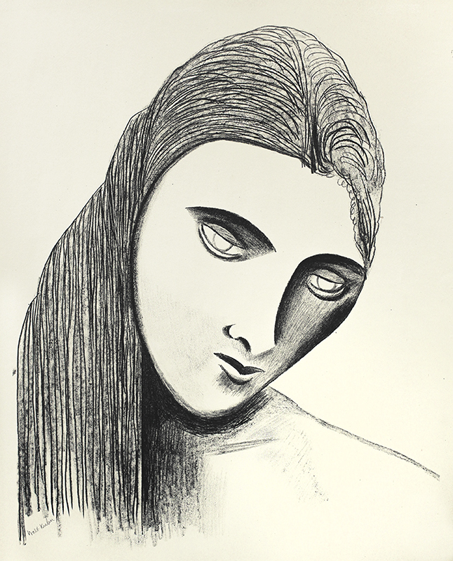 Here, he depicts a woman with long hair as seen from the collarbone up. The curtain of hair frames her oval face and her eyes, deep set and cast downward, appear carved from stone. Overall, the image is peaceful, even meditative, and he would create several portraits in the same vein even as his paintings became darker in composition and mood.