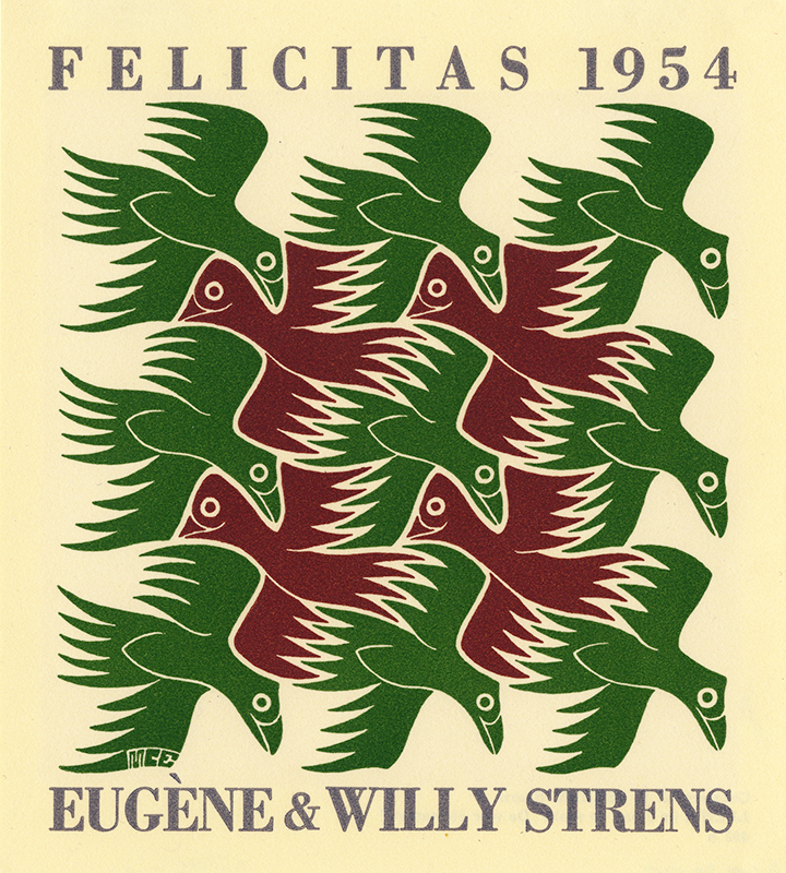 In 1940 he married Hendrika "Willy" Wilhelmina te Strake. In 1943, he was forced to go underground as his brief time as a Dutch officer led to questioning by the Nazis. For the reminder of the war he and his family lived in secret, during which time Strens concentrated on mathematical theory and geometric puzzles. From 1945 on the Strens family lived in Breda, Netherlands, where Eugene died in 1980. He and Willy were friends and patrons of Dutch printmakers, including the mathematical artist Maurits Cornelis Escher, from whom they commissioned many works including these four greeting "cards".