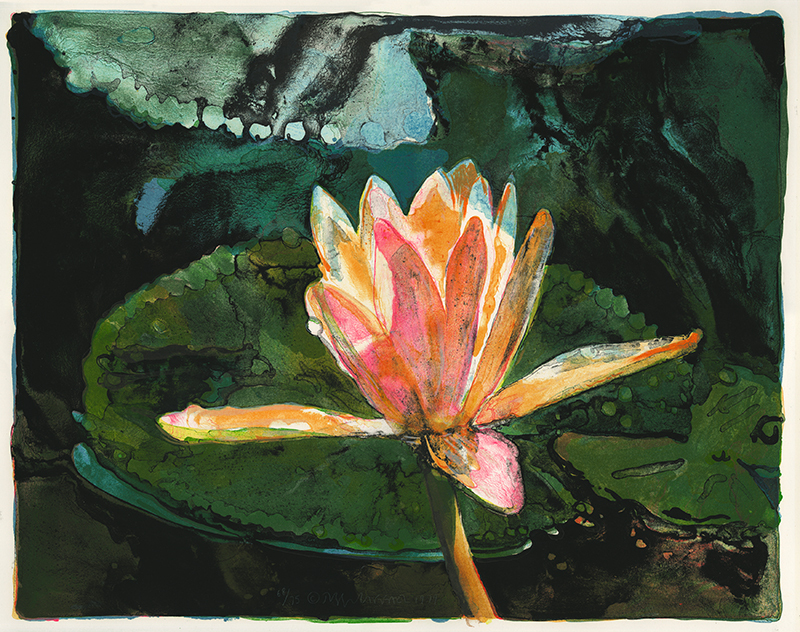 In the mid 1970s, while living in California, Joseph Raffael began working on a series of paintings and prints that concentrated on the effects of light on natural structures, often using the interaction of water and flowers as subjects for this exploration. "New Lily" is handled like an oil painting, with the lily and the lily pads floating on a black background, water in shadow.