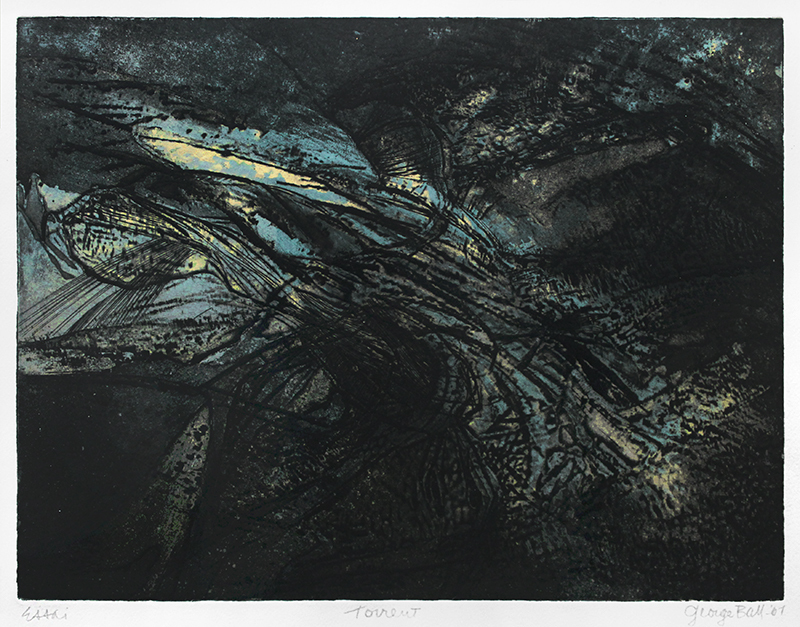 The influence of George Ball's friend and mentor, British artist Stanley William Hayter is evident in the San Francisco-born artist's finely nuanced intaglio, "Torrent".