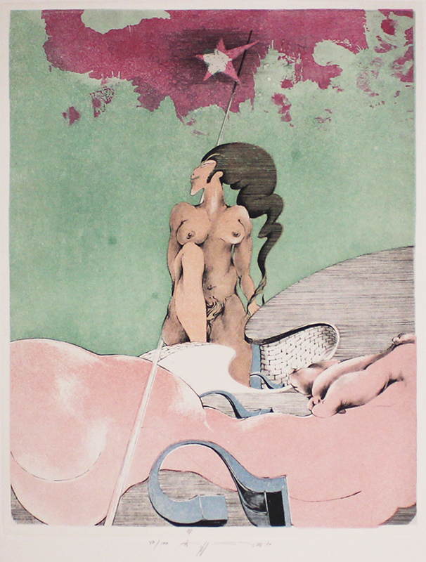 The third plate from Ebhart Eggers’ contemporary, Surrealist take on the play “Lysistrata,” written by 4th century BC Greek playwright Aristophanes. The theme of the work is an early concept for the proverbial “battle of the sexes,” in which the women of Greece demand an end to the ongoing Peloponnesian War by withholding sexual contact from the men of the warring states until their campaign is concluded. In this scene, the Spartan woman Lysistrata sits in her bedchambers, discussing the plan with her recruits. She details how she will revel in keeping her body - one of the few tools of power left to the women of Ancient Greece - to herself until the now decades-long war has ended. Eggers uses the morphed, headless forms of female bodies to represent the hill on which Lysistrata sits, imagining triumph.
