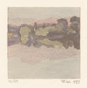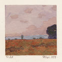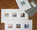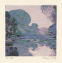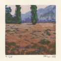 Printmaker Micah Schwaberow studied color woodcut in Japan with Toshi Yoshida. Schwaberow did this portfolio of seven color woodcuts in the Spring of 1988. An accompanying typeset broadside states: "Homage to Monet / Seven Fragments / of / Compositions / by / Claude Monet / as Performed on the Woodblock by Micah Schwaberow." The woodcuts, which are housed in a folding gray cloth portfolio, include seven color woodcuts, each pencil signed and numbered, each matted with a 2py mats which are also signed, numbered and titled. The prints are titled, from left to right: 1. Field of Oats; 2. Bennecourt; 3. Branch of the Seine; 4m Near Giverny; 5. Field of Poppies; 6. Five Poplars; 7. Port-Villez.